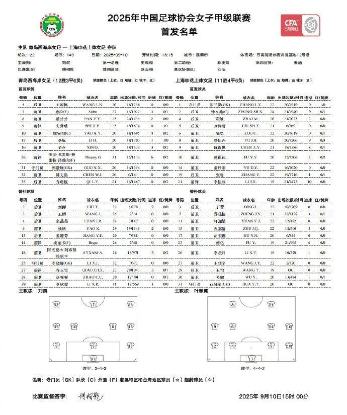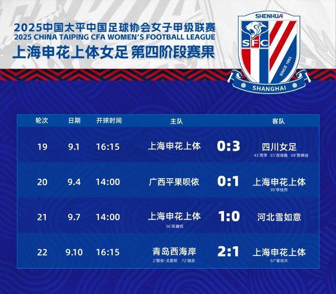 9月10日,2025中国太平中国足协女甲联赛(第四阶段)第22轮战罢。申花上体女足在本阶段比赛中绝杀领头羊广西平果呗侬、力克河北雪如意,负于积分榜第二的四川女足和第三的青岛西海岸,4战2胜2负,总战绩22轮11胜4平7负,积37分暂列联赛第五。